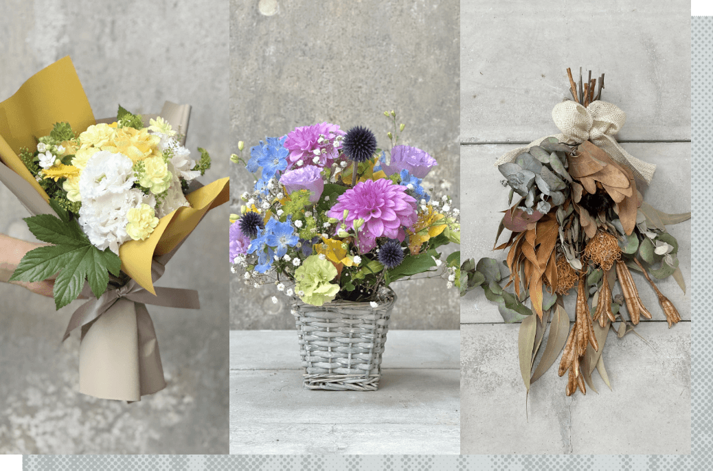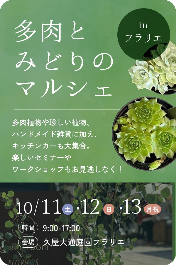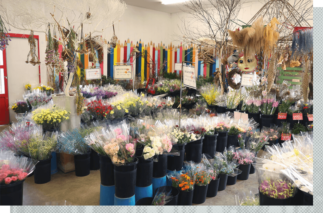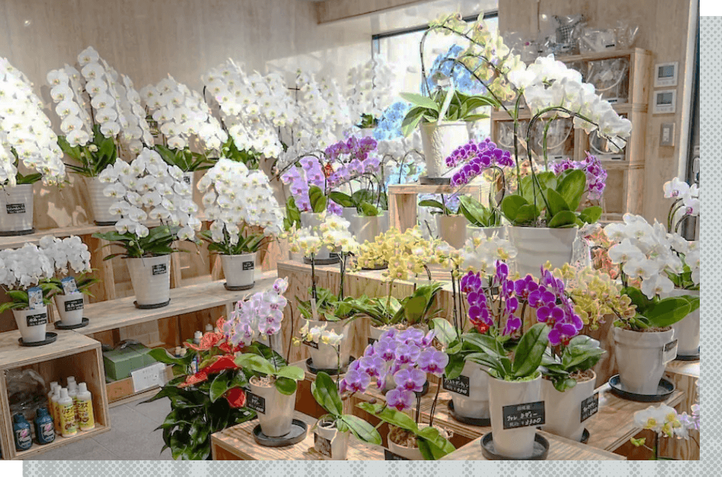 愛知県内にグループ2店舗展開。生花、観葉植物、花苗、ドライフラワー、花器や雑貨が充実し、胡蝶蘭などの祝い花も上質なものを常時ご用意。販売だけでなく、個人宅やオフィスの植物コーディネートサービスも行っています。花と緑のことなら何でもご相談ください。