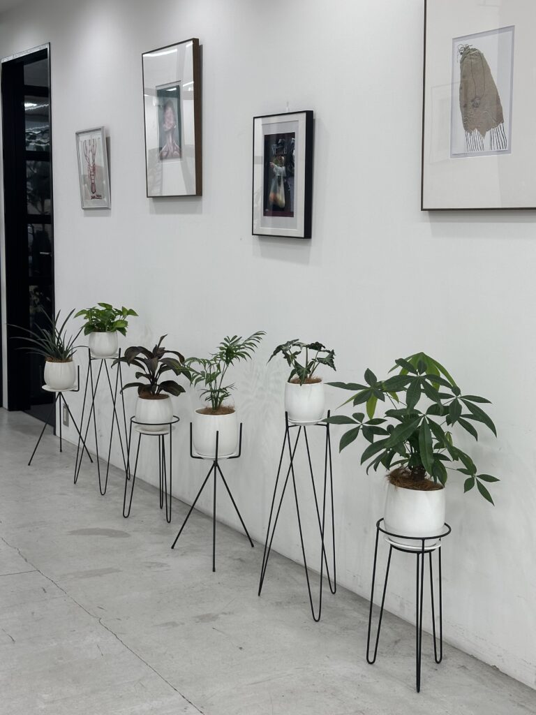 その中で植物が浮かび上がるような美しいコントラストを作るため、鉢やスタンドもモノトーンで統一。余分な装飾を排除し、グリーンのフォルムそのものがデザインの主役になるよう意識しました。