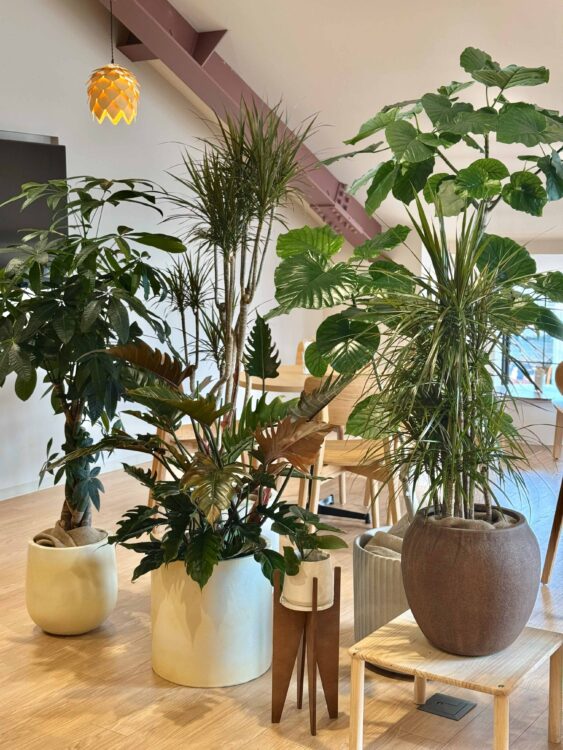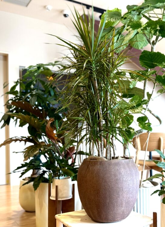 本案件では、植物の選定だけでなく、什器を含めたトータルコーディネートをご提案。木製やアイアン素材の什器を用いることで、家具や内装との統一感を持たせ、植物がより美しく引き立つディスプレイを構築しています。