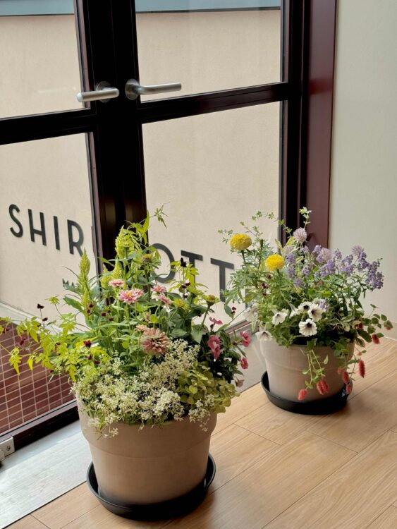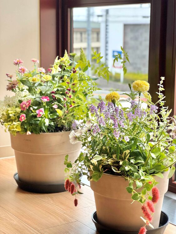 店内には、高さや葉姿の異なる観葉植物を配置し、視線の流れと奥行きを演出。加えて、季節感や彩りを感じられる花苗も取り入れることで、来店のたびに小さな変化を感じられるカフェ空間を実現しました。